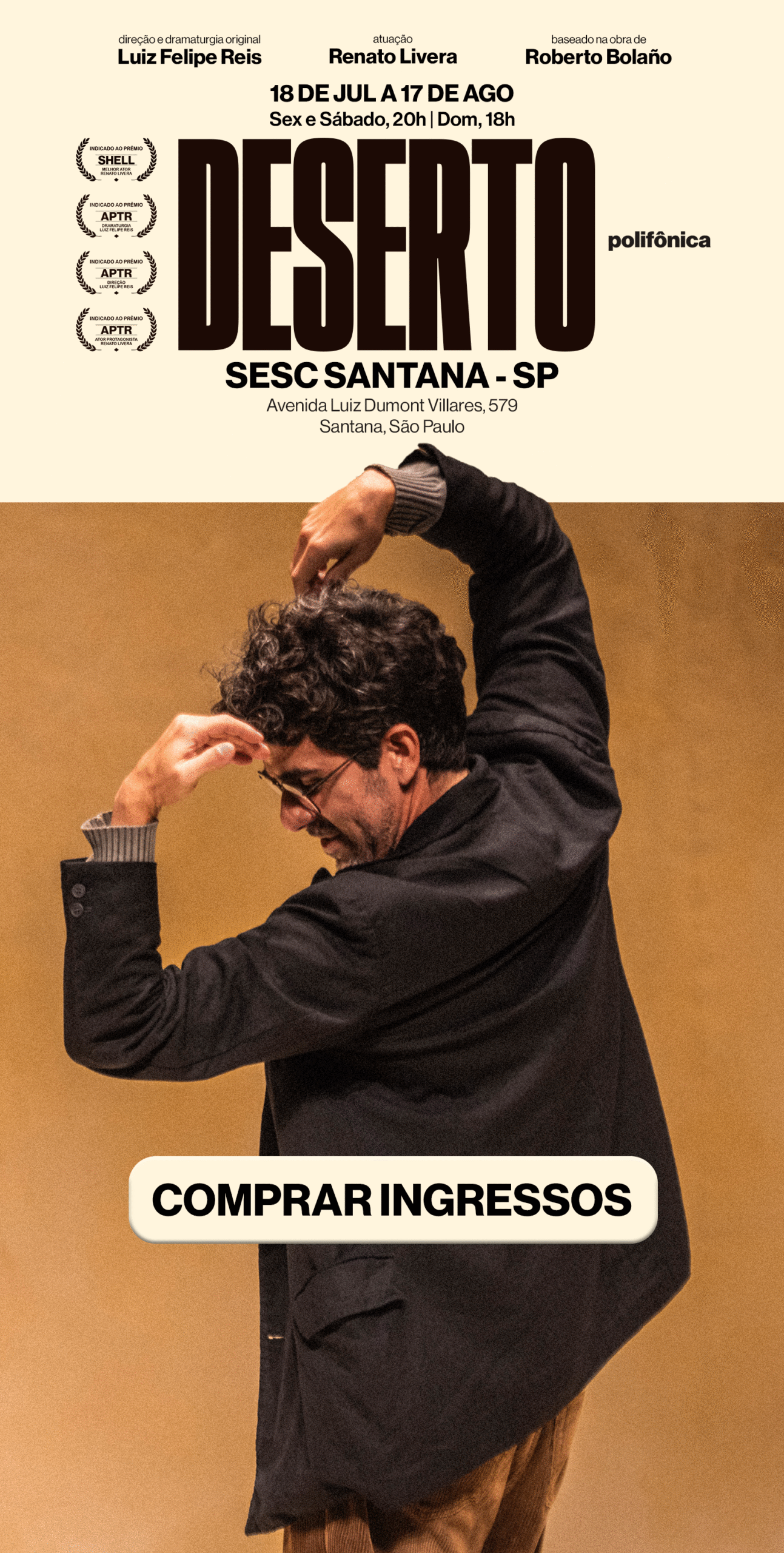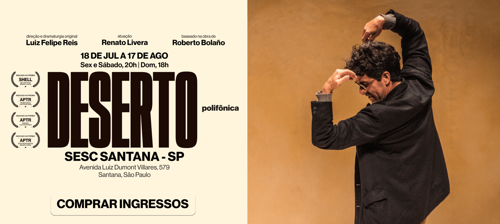 Pela primeira vez no Brasil, a obra de Roberto Bolaño (1953-2003) ganha vida nos palcos, a partir de fragmentos de livros, entrevistas e memórias do autor chileno, considerado um dos maiores escritores latino-americanos do século XXI. Livera incorpora Bolaño, emprestando corpo e voz a trechos de obras como A universidade desconhecida, 2666, O gaúcho insofrível, Entre parêntesis e Bolaño por si mesmo. Fruto de uma extensa pesquisa, DESERTO costura poemas, contos, crônicas, palestras e entrevistas, revelando as inquietações existenciais e artísticas de Bolaño é especialmente nos seus últimos anos, quando, já doente, se dedicava intensamente à criação. A dramaturgia do espetáculo não reconstitui sua biografia de modo linear, mas traça um percurso simbólico, poético e fragmentado por sua memória e escrita.